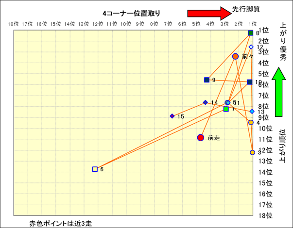 近走における4コーナーでの位置取りと上がり順位(頭数補正後) |