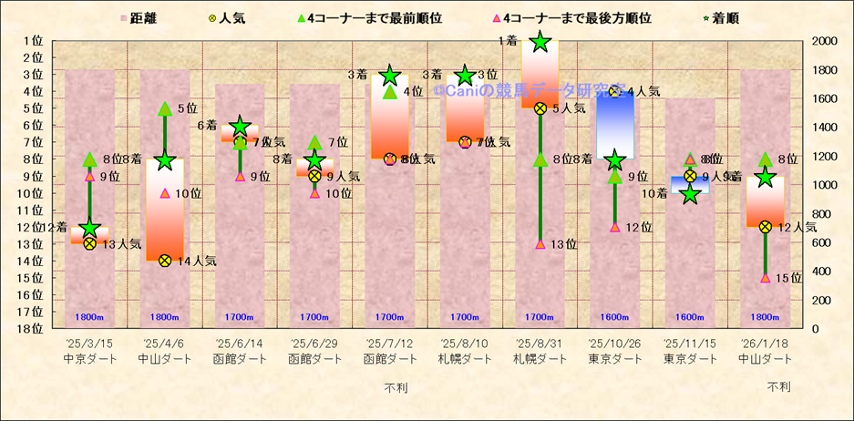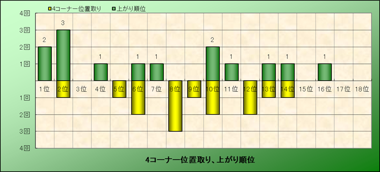 脚質解析 近20レースの4コーナーでの位置取りと上がり順位(頭数補正後) |