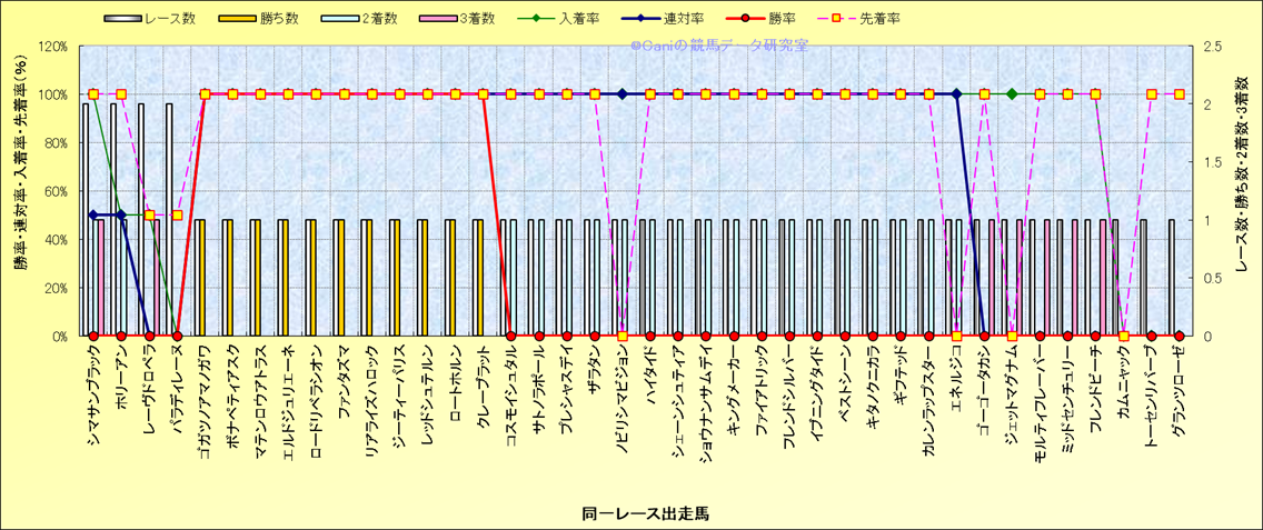 ライバル(相性)解析 同一レースに下記馬が出走した場合の成績とその馬に先着する先着率 |