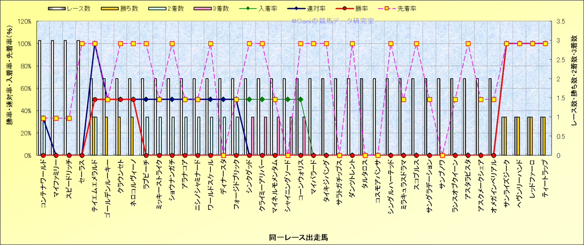 ライバル(相性)解析 同一レースに下記馬が出走した場合の成績とその馬に先着する先着率 |
