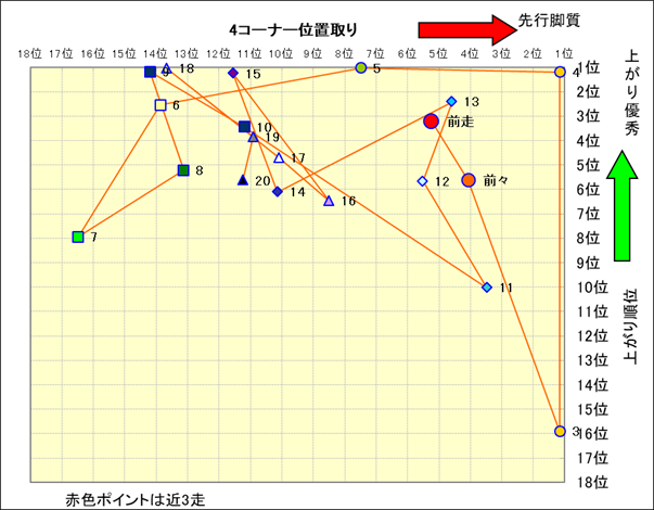 脚質解析 近20レースの4コーナーでの位置取りと上がり順位(頭数補正後) |