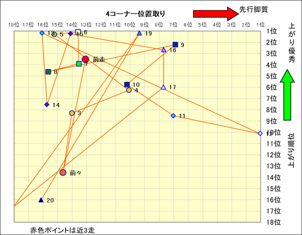 近走における4コーナーでの位置取りと上がり順位(頭数補正後) |