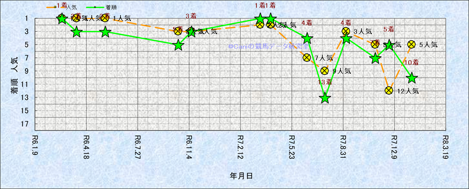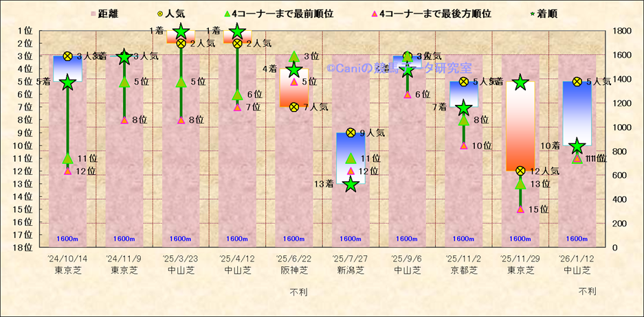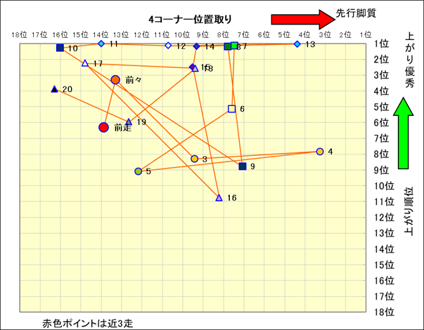 脚質解析 近20レースの4コーナーでの位置取りと上がり順位(頭数補正後) |
