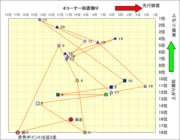 脚質解析 近20レースの4コーナーでの位置取りと上がり順位(頭数補正後) |