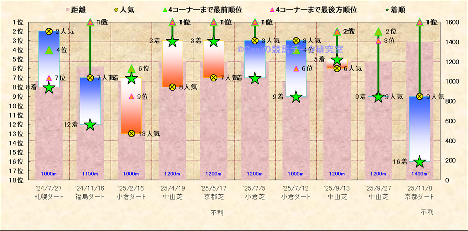 脚質解析 近20レースの4コーナーでの位置取りと上がり順位(頭数補正後) |