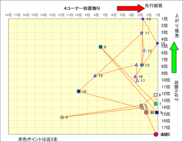 近走における4コーナーでの位置取りと上がり順位(頭数補正後) |