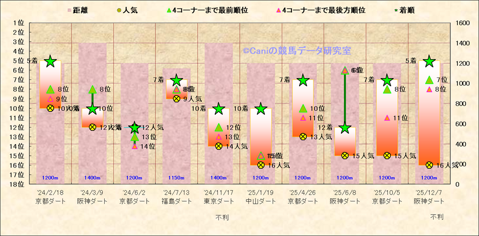 脚質解析 近20レースの4コーナーでの位置取りと上がり順位(頭数補正後) |