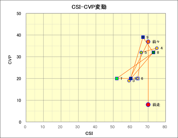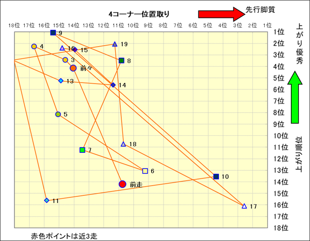 近走における4コーナーでの位置取りと上がり順位(頭数補正後) |