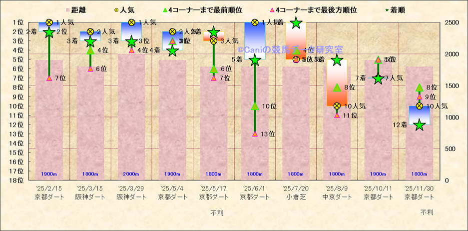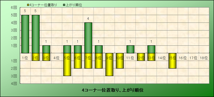 脚質解析 近20レースの4コーナーでの位置取りと上がり順位(頭数補正後) |