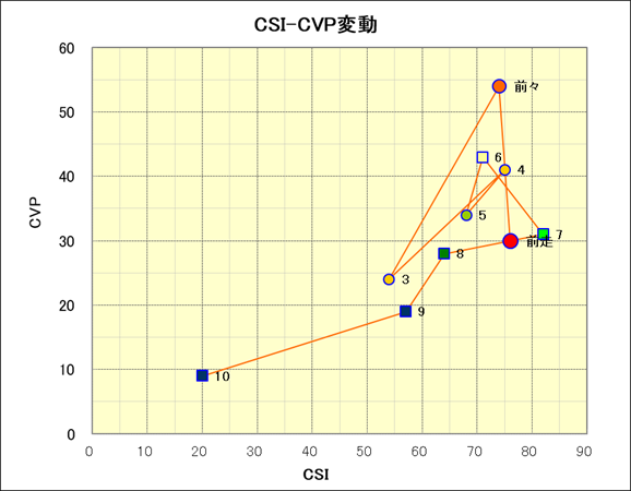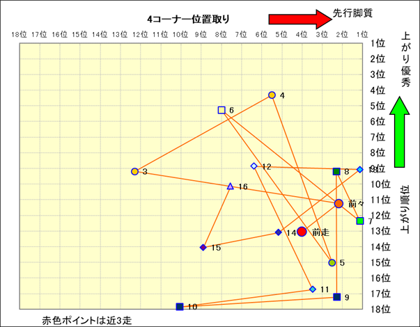 近走における4コーナーでの位置取りと上がり順位(頭数補正後) |