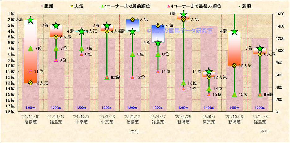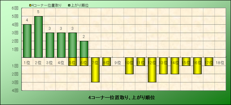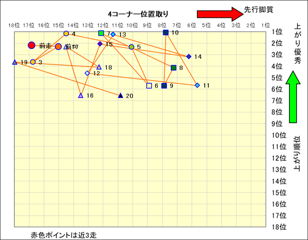 脚質解析 近20レースの4コーナーでの位置取りと上がり順位(頭数補正後) |
