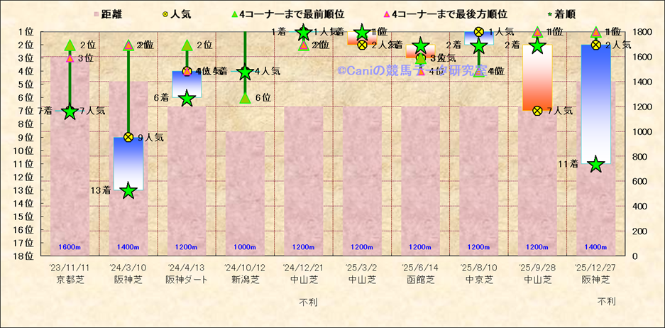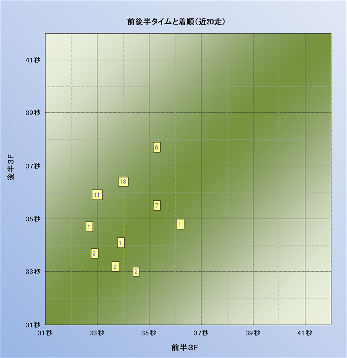 脚質解析 近20レースの4コーナーでの位置取りと上がり順位(頭数補正後) |