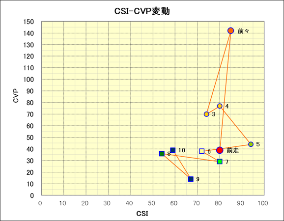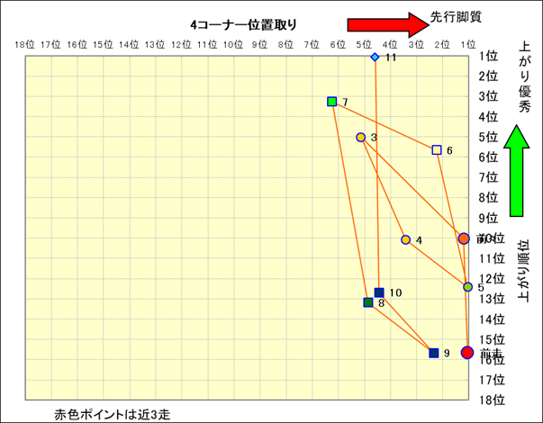 近走における4コーナーでの位置取りと上がり順位(頭数補正後) |
