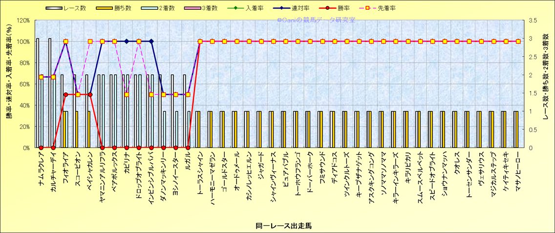 ライバル(相性)解析 同一レースに下記馬が出走した場合の成績とその馬に先着する先着率 |