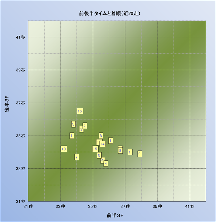 脚質解析 近20レースの4コーナーでの位置取りと上がり順位(頭数補正後) |