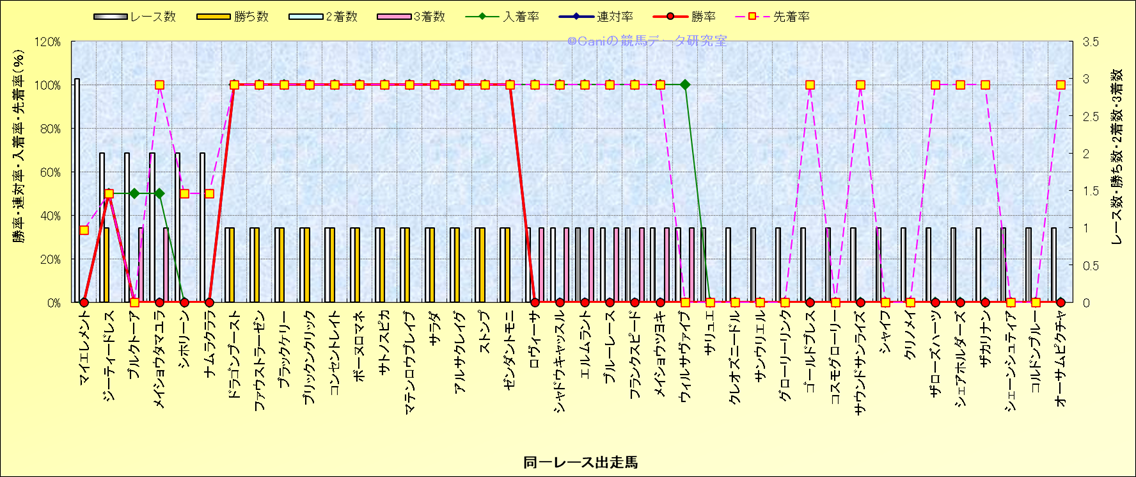ライバル(相性)解析 同一レースに下記馬が出走した場合の成績とその馬に先着する先着率 |