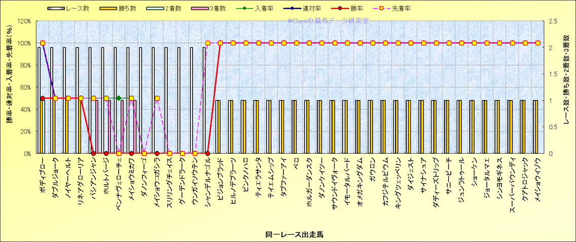 ライバル(相性)解析 同一レースに下記馬が出走した場合の成績とその馬に先着する先着率 |