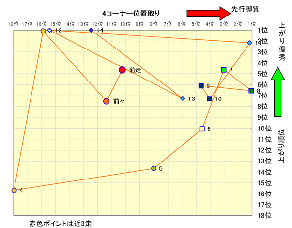 近走における4コーナーでの位置取りと上がり順位(頭数補正後) |