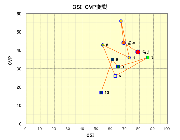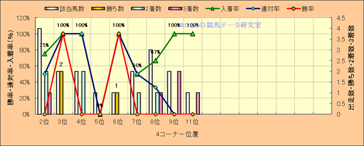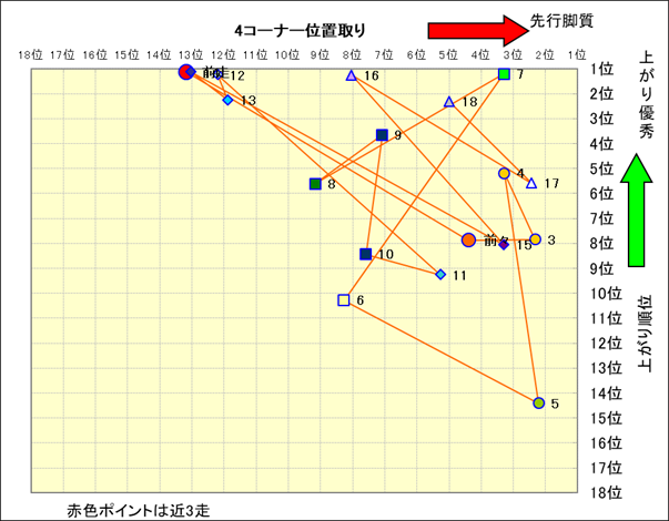 近走における4コーナーでの位置取りと上がり順位(頭数補正後) |