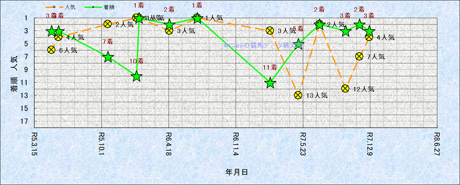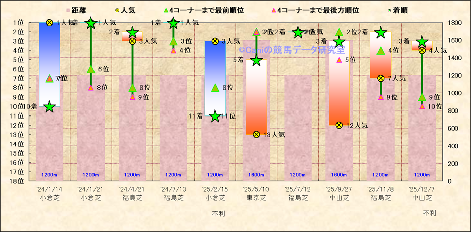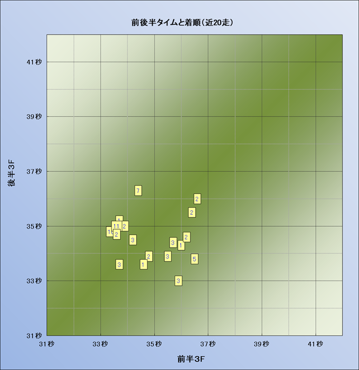 脚質解析 近20レースの4コーナーでの位置取りと上がり順位(頭数補正後) |