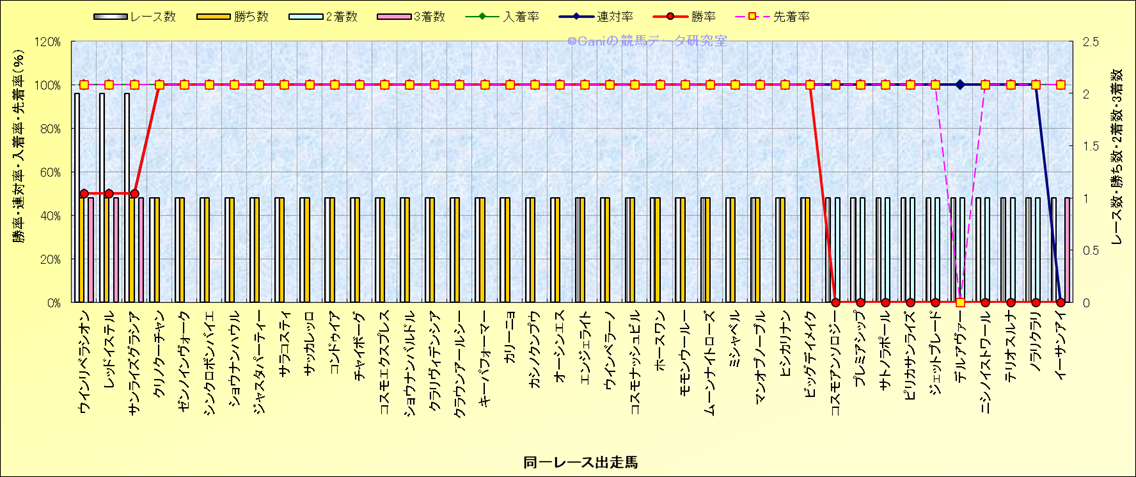 ライバル(相性)解析 同一レースに下記馬が出走した場合の成績とその馬に先着する先着率 |