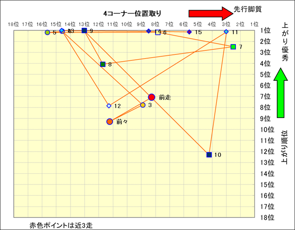近走における4コーナーでの位置取りと上がり順位(頭数補正後) |