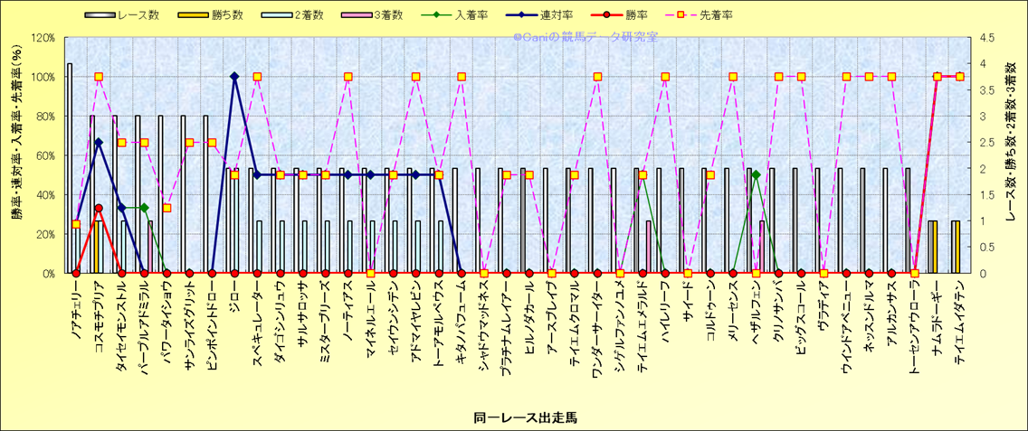 ライバル(相性)解析 同一レースに下記馬が出走した場合の成績とその馬に先着する先着率 |