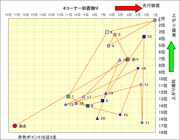 脚質解析 近20レースの4コーナーでの位置取りと上がり順位(頭数補正後) |