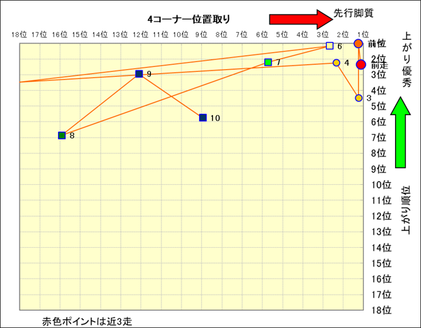 近走における4コーナーでの位置取りと上がり順位(頭数補正後) |