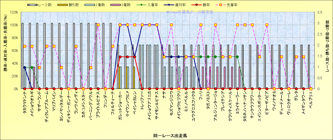 ライバル(相性)解析 同一レースに下記馬が出走した場合の成績とその馬に先着する先着率 |