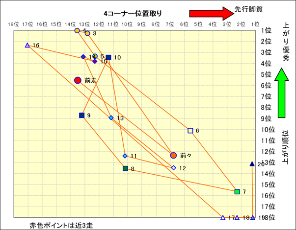 近走における4コーナーでの位置取りと上がり順位(頭数補正後) |