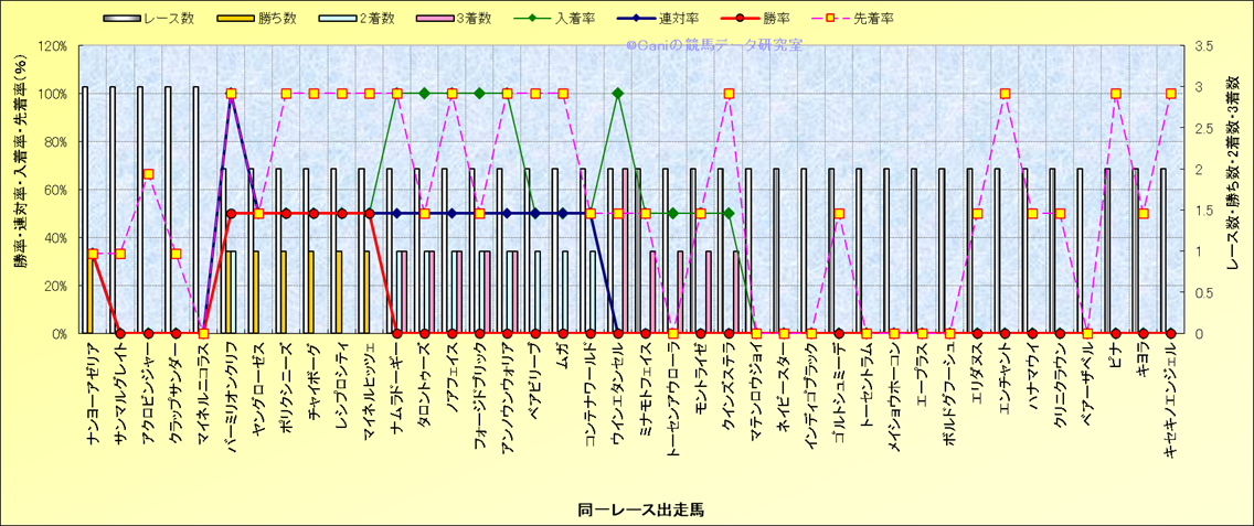 ライバル(相性)解析 同一レースに下記馬が出走した場合の成績とその馬に先着する先着率 |