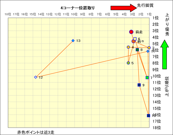 近走における4コーナーでの位置取りと上がり順位(頭数補正後) |