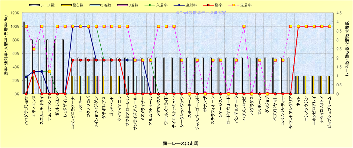 ライバル(相性)解析 同一レースに下記馬が出走した場合の成績とその馬に先着する先着率 |