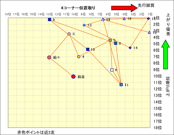 近走における4コーナーでの位置取りと上がり順位(頭数補正後) |