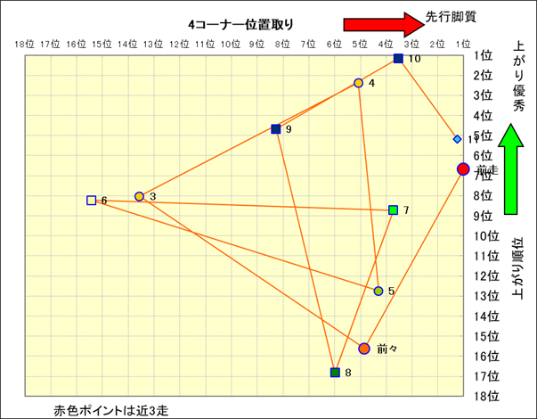 近走における4コーナーでの位置取りと上がり順位(頭数補正後) |