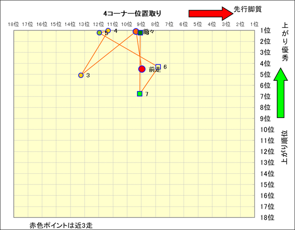 近走における4コーナーでの位置取りと上がり順位(頭数補正後) |