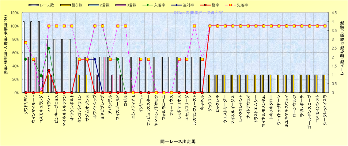 ライバル(相性)解析 同一レースに下記馬が出走した場合の成績とその馬に先着する先着率 |