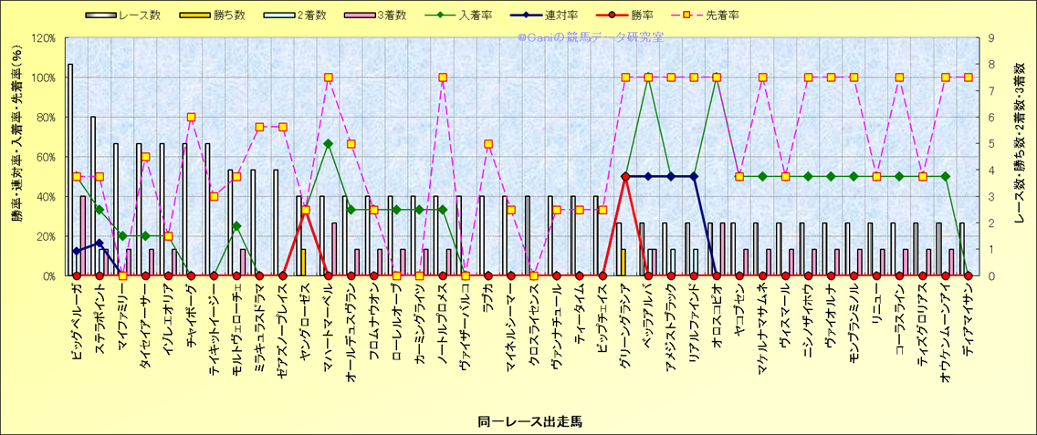 ライバル(相性)解析 同一レースに下記馬が出走した場合の成績とその馬に先着する先着率 |