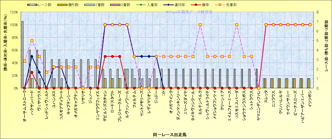 ライバル(相性)解析 同一レースに下記馬が出走した場合の成績とその馬に先着する先着率 |