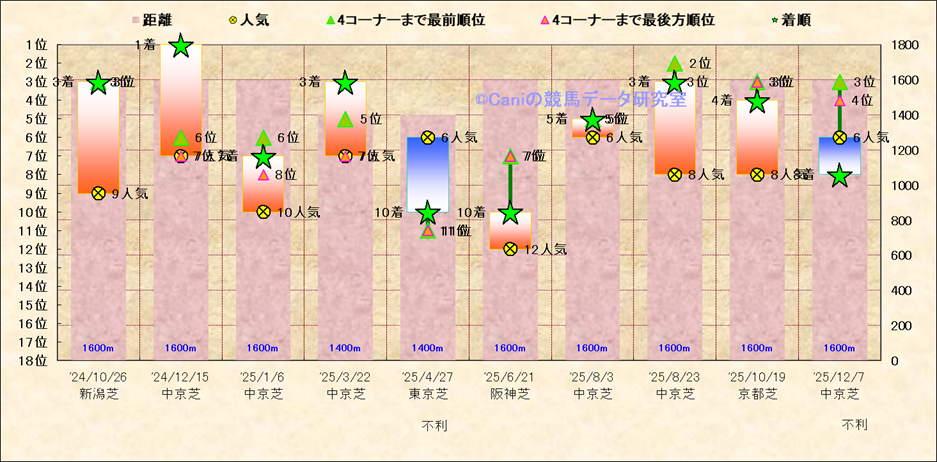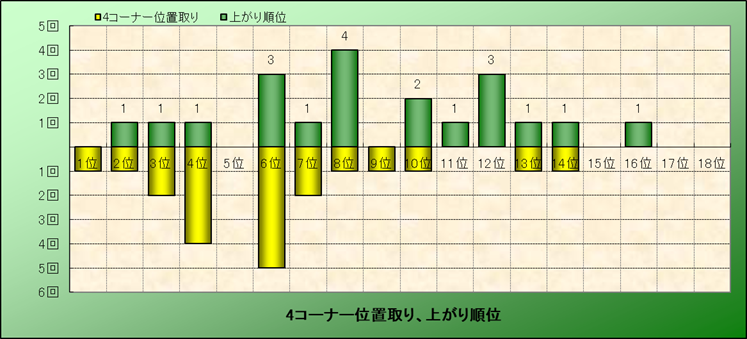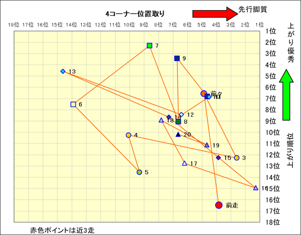 脚質解析 近20レースの4コーナーでの位置取りと上がり順位(頭数補正後) |