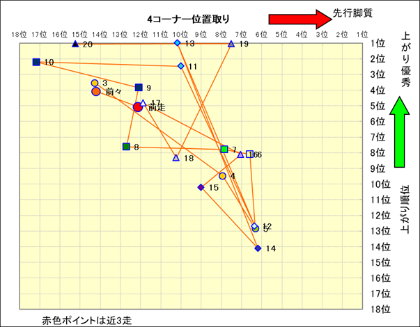 脚質解析 近20レースの4コーナーでの位置取りと上がり順位(頭数補正後) |