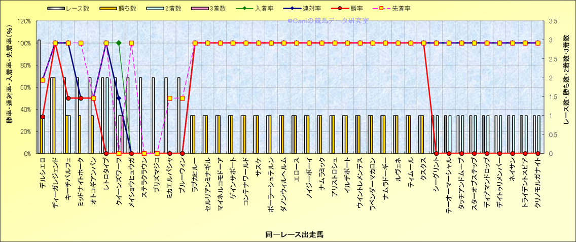 ライバル(相性)解析 同一レースに下記馬が出走した場合の成績とその馬に先着する先着率 |