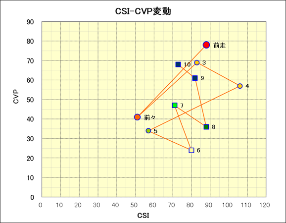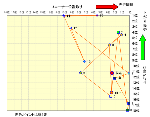 近走における4コーナーでの位置取りと上がり順位(頭数補正後) |