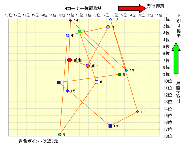 近走における4コーナーでの位置取りと上がり順位(頭数補正後) |