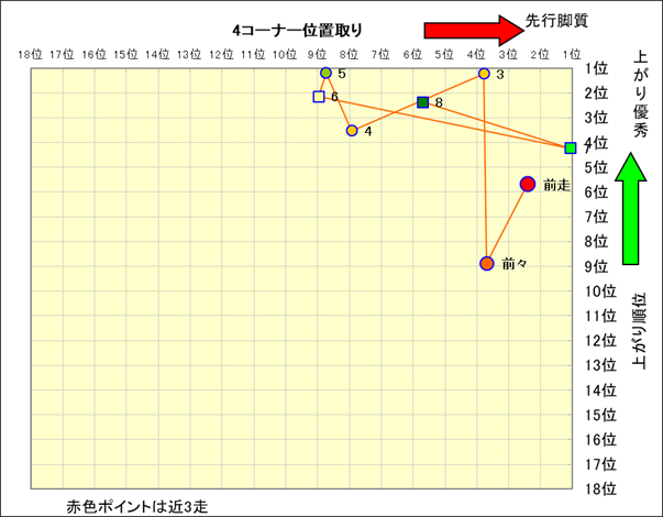 近走における4コーナーでの位置取りと上がり順位(頭数補正後) |
