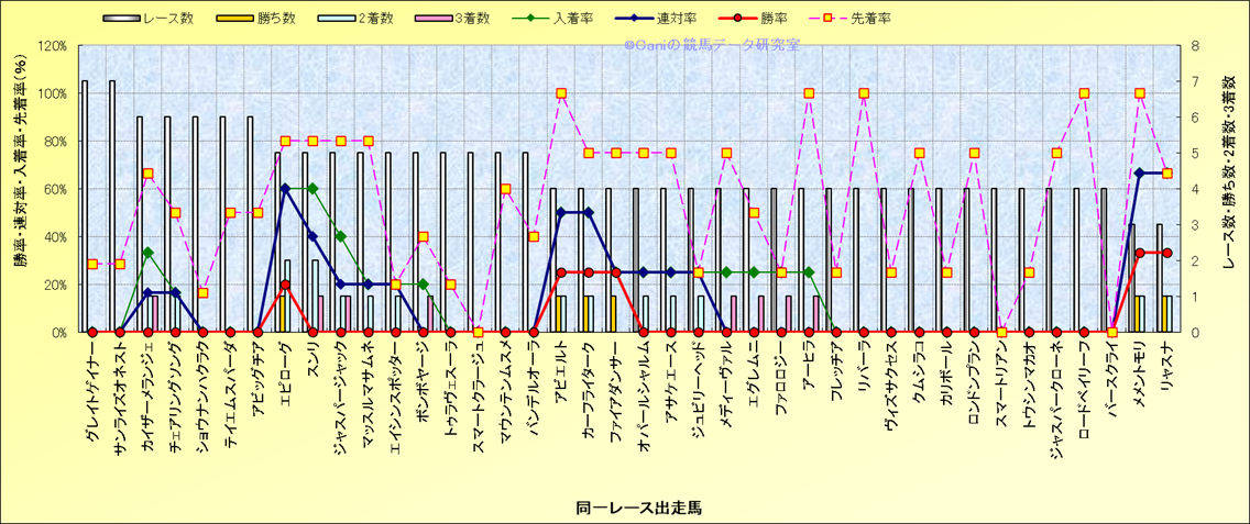 ライバル(相性)解析 同一レースに下記馬が出走した場合の成績とその馬に先着する先着率 |