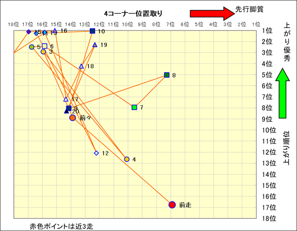 脚質解析 近20レースの4コーナーでの位置取りと上がり順位(頭数補正後) |