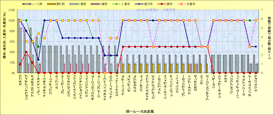ライバル(相性)解析 同一レースに下記馬が出走した場合の成績とその馬に先着する先着率 |