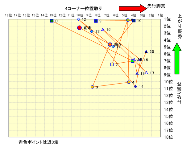 近走における4コーナーでの位置取りと上がり順位(頭数補正後) |